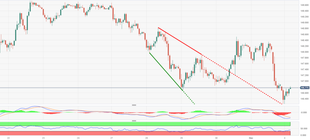 趋势回顾:日元延续了上周五对美元的强劲涨幅,并以积极的基调开启了新的一周,在亚洲交易时段,美元兑日元汇率跌至近三周低点146.25-146.20附近。