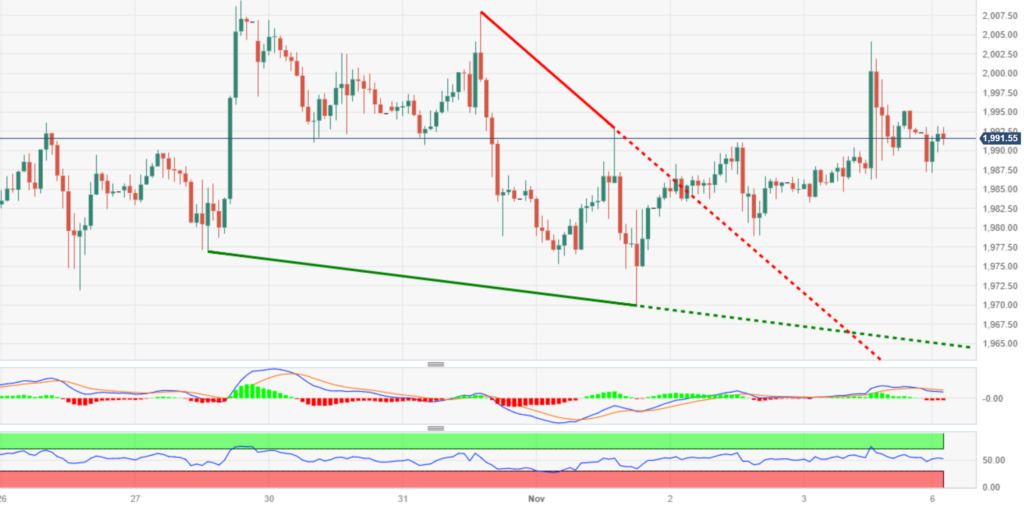 趋势回顾:周一,金价在本周初徘徊在2000美元下方,在美元和美债收益率双双回升之际,买家稍作休息。乐观情绪也限制了金价的上行空间。