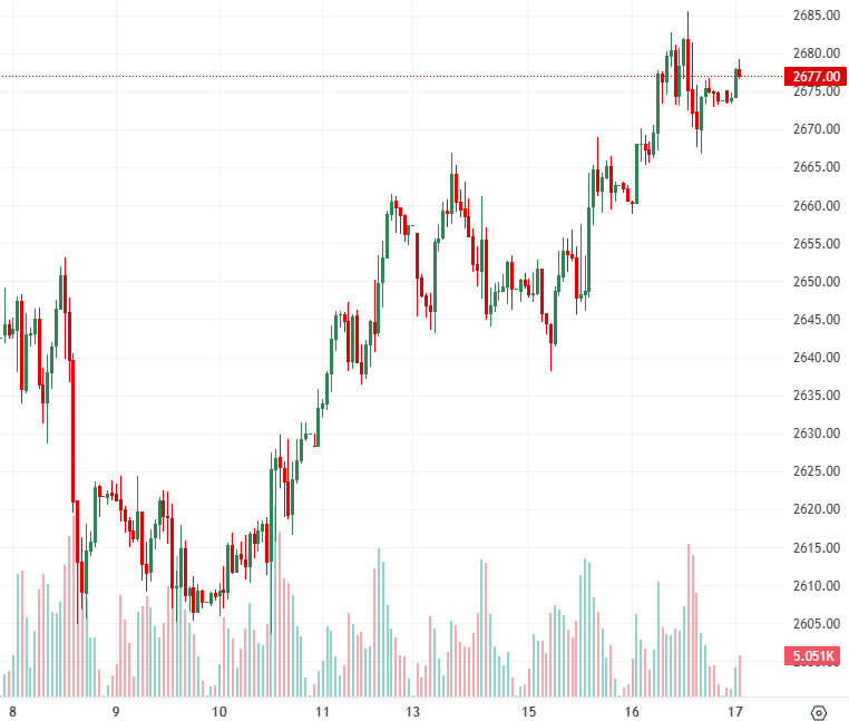 周四(10月17日)亚盘早盘,现货黄金高位震荡,目前交投于2676.93美元/盎司附近。周三金价一度升至历史高位,盘中最高触及2685.15美元/盎司。美债收益率走弱、主要央行降息预期支撑无息黄金上涨,地缘政治冲突持续提供额外避险支撑。