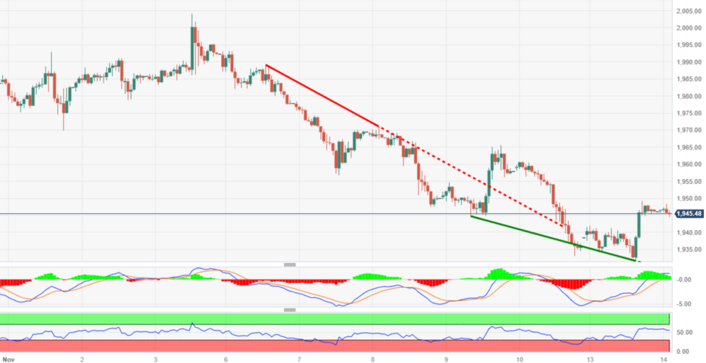 趋势回顾:金价吸引了一些买家,周二亚洲早盘交易时段金价交投于 1,946 美元附近。 贵金属的上涨受到美元疲软和美国国债收益率下降的支撑。 投资者等待美国 10 月份消费者物价指数 (CPI) 数据以寻求新的动力。