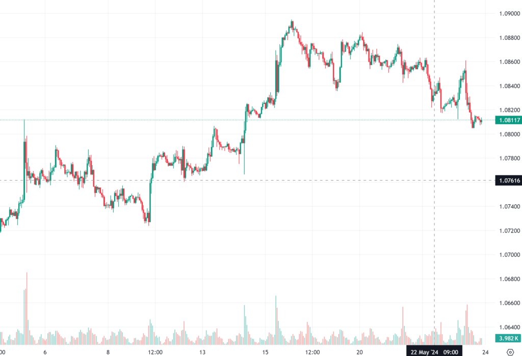 趋势回顾:周四,欧元/美元走低,逼近 1.0800 关口,此前美国服务业 PMI 数据意外上升,再次引发人们对美联储降息幅度较小的担忧。 尽管当天早些时候的 HCOB PMI 数据好于预期,但这仍促使投资者转向避险美元,并使欧元贬值。