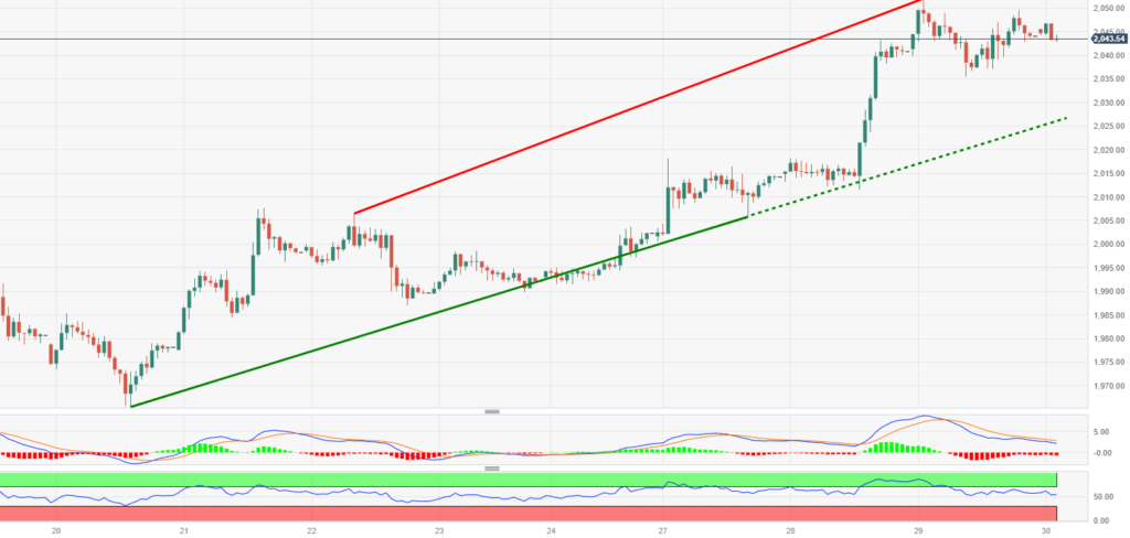 趋势主题:中国PMI数据公布后,金价在2050美元下方盘整涨幅。