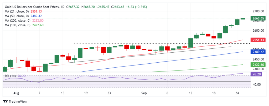 周三早盤,金價在曆史最高水平 2,664 美元附近盤整,在市場風險偏好和日綫圖上極度超買的環境下,金價難以穫得新的上行動力。
