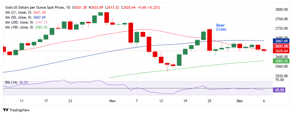 日線圖顯示,隨著 14 日相对强弱指数 (rsi) 跌破中線,黄金价格已突破近期区间并开始下跌。上周的熊市交叉继续充当阻力,这进一步证实了黄金价格再次下跌。日线收盘价低于关键短期 21 日简单移动平均线 (sma) 2,631 美元,可能会增强下行空间。下一个支撑位位于上周低点 2,605 美元,低于该支撑位,100 日 sma 2,583 美元将成为黄金买家的底线。