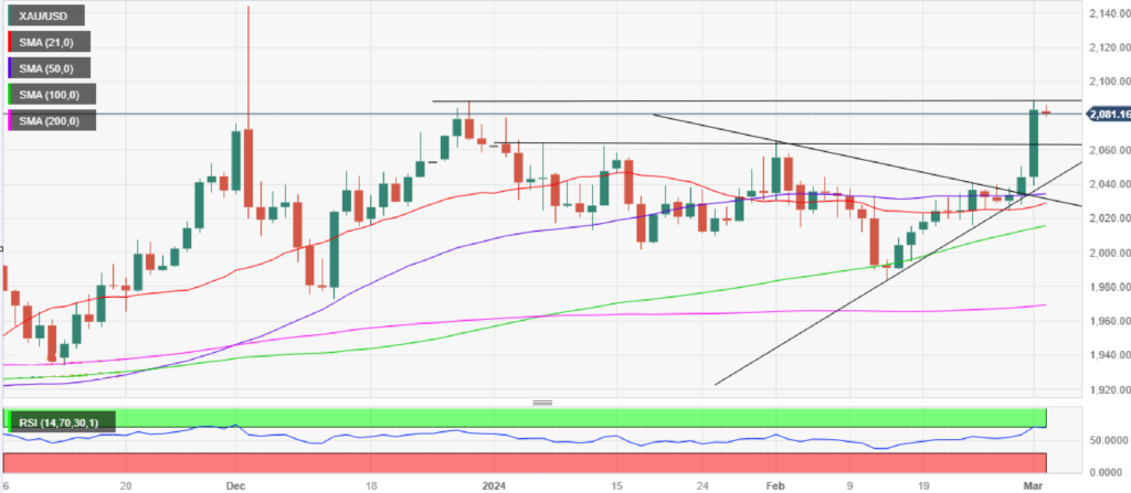 在日線圖技術面上,金價在周四突破對稱三角形後,周五強勢反彈。目前,14日相對強弱指數(rsi)已從超買區回落至69.50附近,暗示還有更多上行空間。當前阻力位目前位於2088美元至2089美元附近的數月高位,該水准上方將測試2100美元的門檻。如果買盤勢頭加強,則不排除金價將測試2144美元的歷史高點。