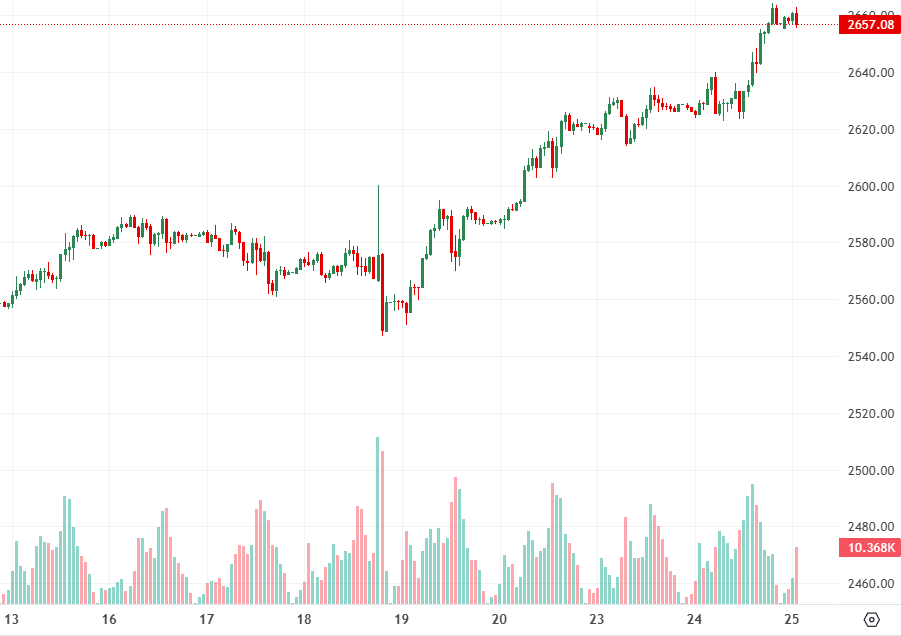 在美國消費者信心下降和美元走弱的背景下,黄金價格創下 2,664 美元的新高,XAU/USD 交易價爲 2,651 美元。美聯儲理事米歇爾鮑曼錶示將謹慎降息。中東的地緣政治緊張局勢也刺激了對黄金的避險需求,推動貴金屬價格創下新高。